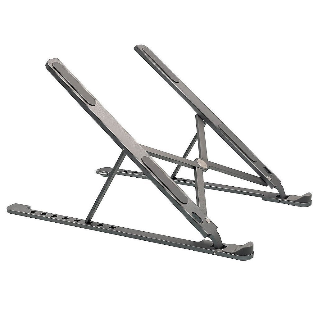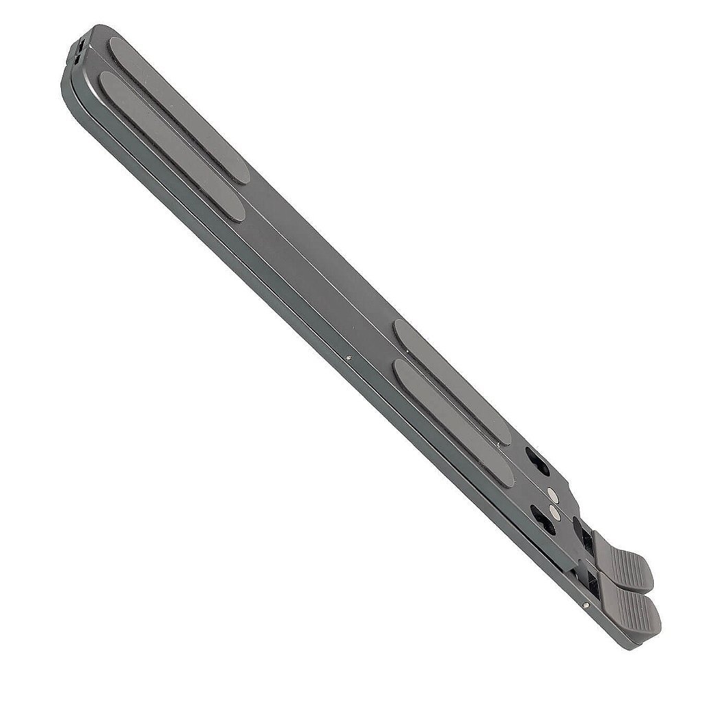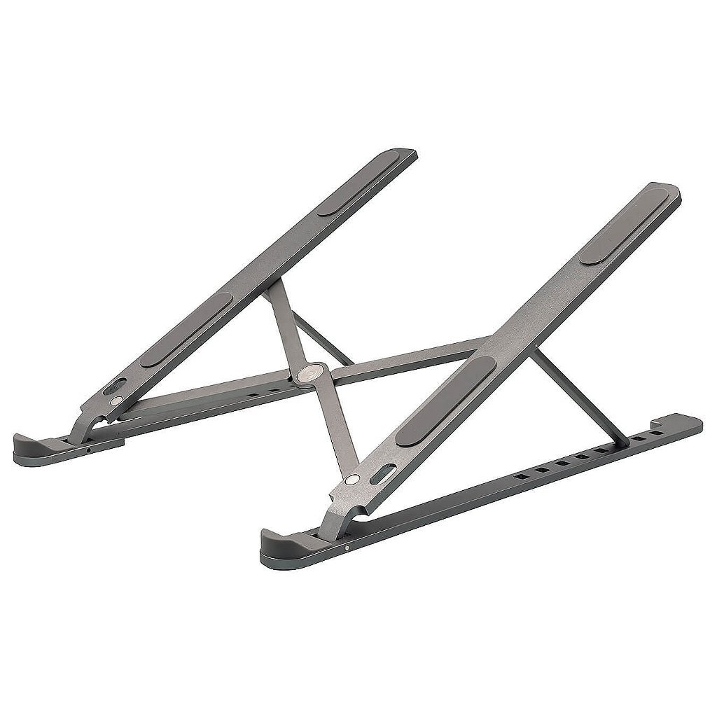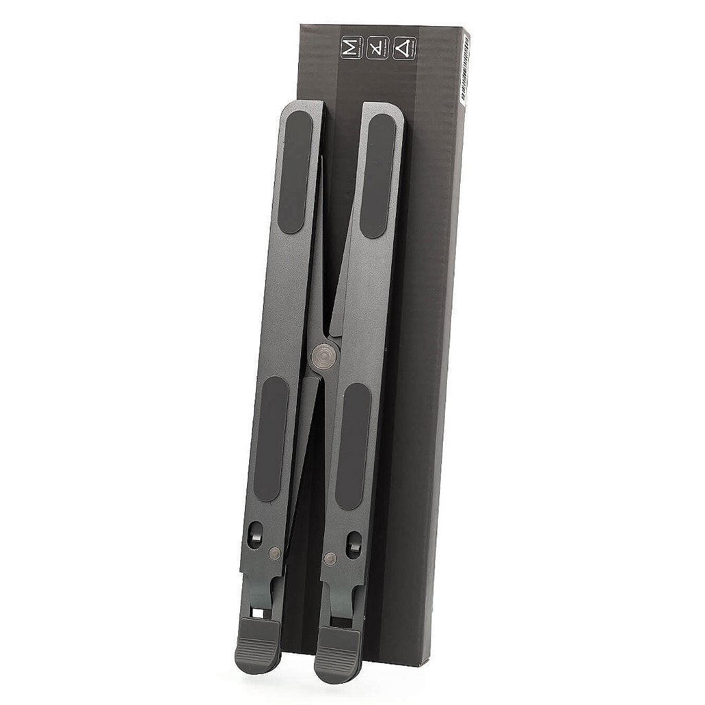 Suporte para Notebook e Tablet com 6 níveis de ajuste de altura, feito em alumínio de alta qualidade, com acabamento emborrachado, que garante durabilidade e conforto.